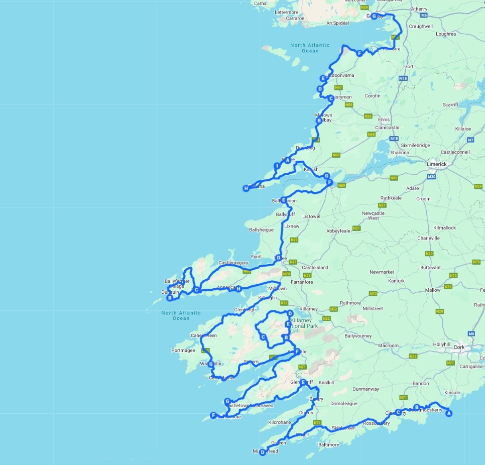 The journey travels the Mizen, Beara, Iveragh and Dingle Peninsulas. It passes through the counties of Cork, Kerry, Clare and Galway. Famous Discovery Points such as Slea Head Drive, Conor Pass, Inch Beach, Ring of Kerry, the Gaps of Mamore and Ballaghbema, and the Burren Coast Road are included on this route.