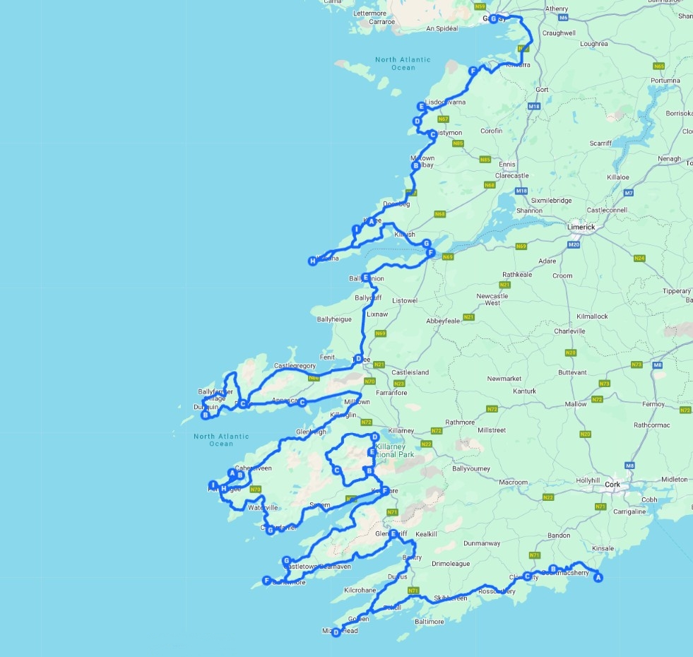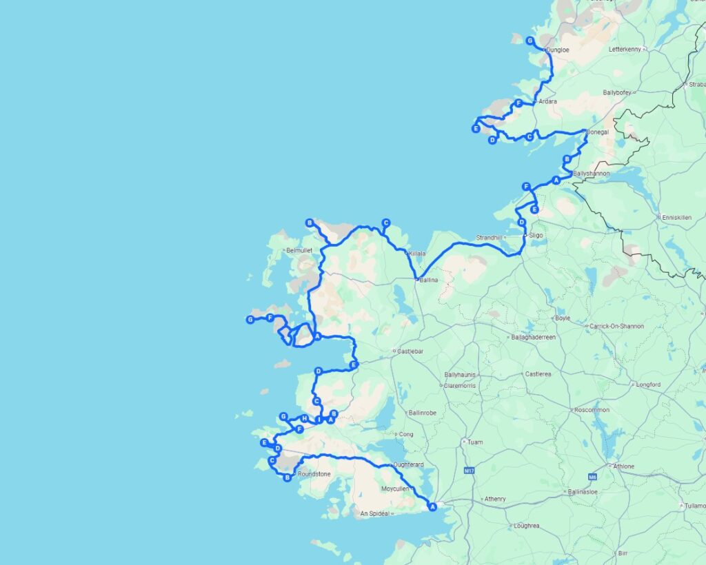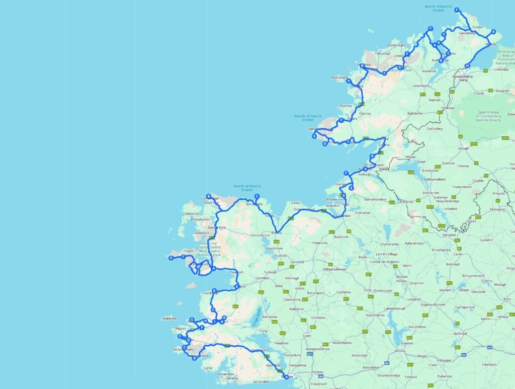 This Itinerary will take you to ALL the Signature Points on the Wild Atlantic Way. It is about 47 hours of driving and about 2,600 km in total. But there are about 47 hours of stopping time along the way which means you can see a lot more than on the other trips.